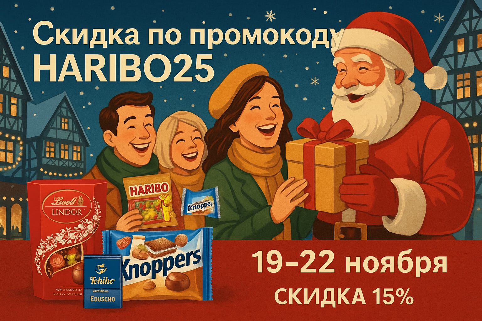 В акции участвуют такие марки, как Lindt, Haribo, Eduscho, Knoppers и другие. Lindt — один из самых известных швейцарских шоколадных домов, создающий премиальный шоколад с 1845 года. Haribo — легендарные немецкие желейные сладости, производимые с 1920 года; именно эта компания подарила миру знаменитых золотых медвежат. Eduscho — классический немецкий кофе с насыщенным ароматом и стабильным качеством обжарки. Knoppers — популярные немецкие вафельные батончики и снеки с характерным сочетанием хрустящей вафли, молочного крема, карамели и орехов.